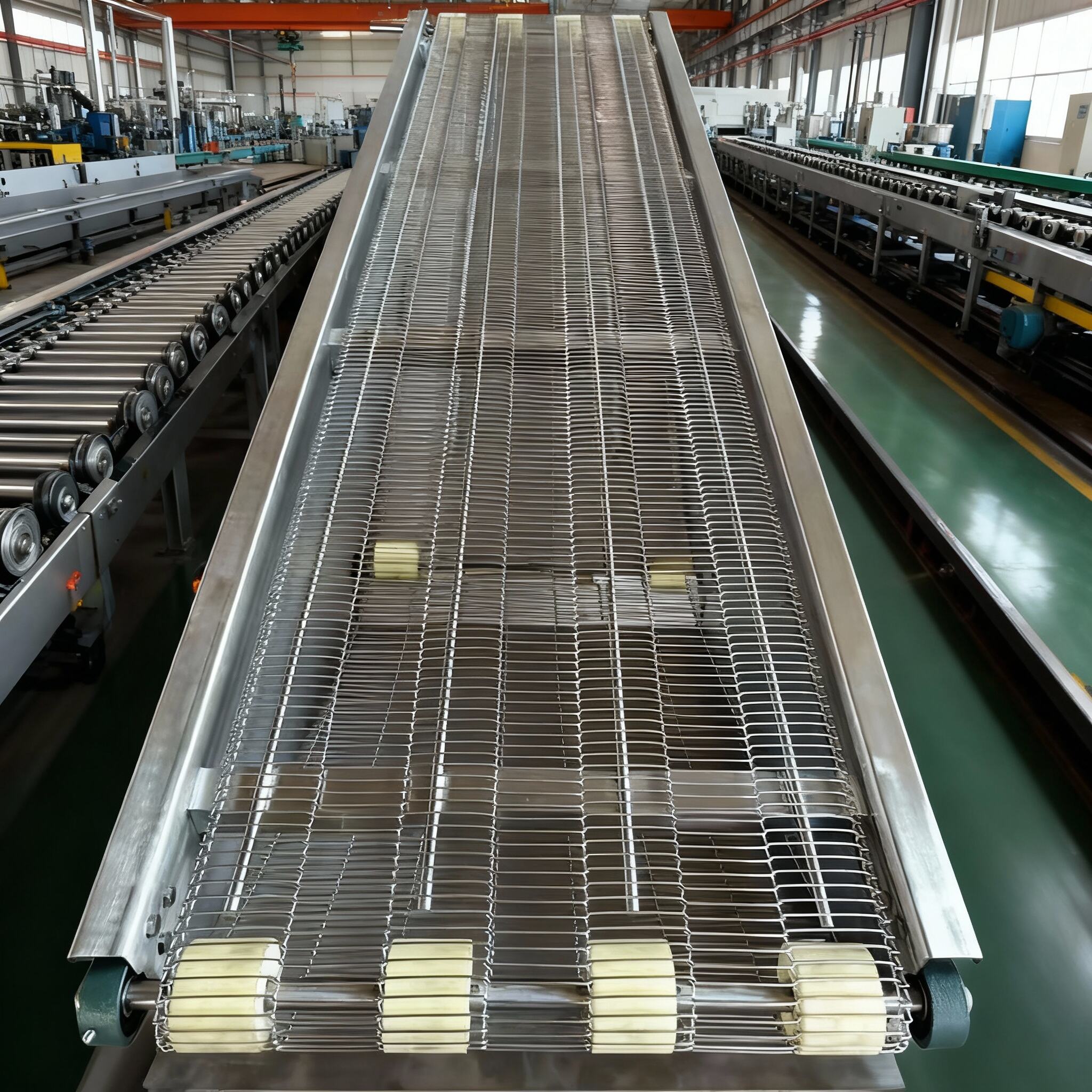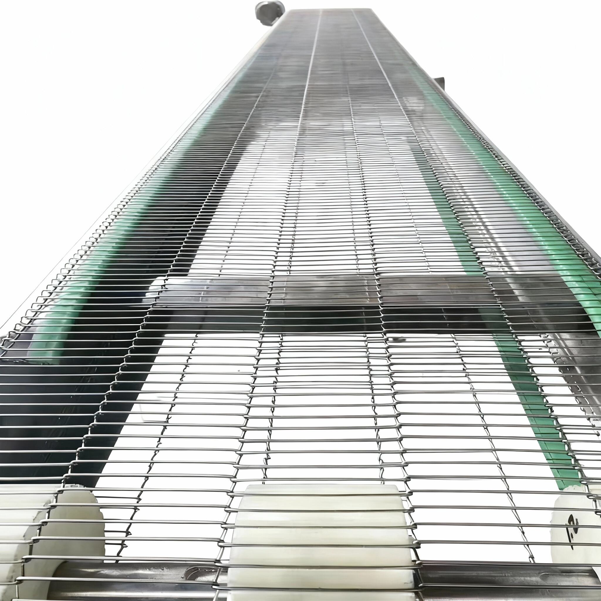 Operating features: The flat flex wire mesh belt conveyor can perform horizontal, inclined, and vertical conveyance, and can also form spatial conveying lines, which are generally fixed. The conveyor has a large conveying capacity and long conveying distance, and can simultaneously complete multiple process operations during the conveying process.