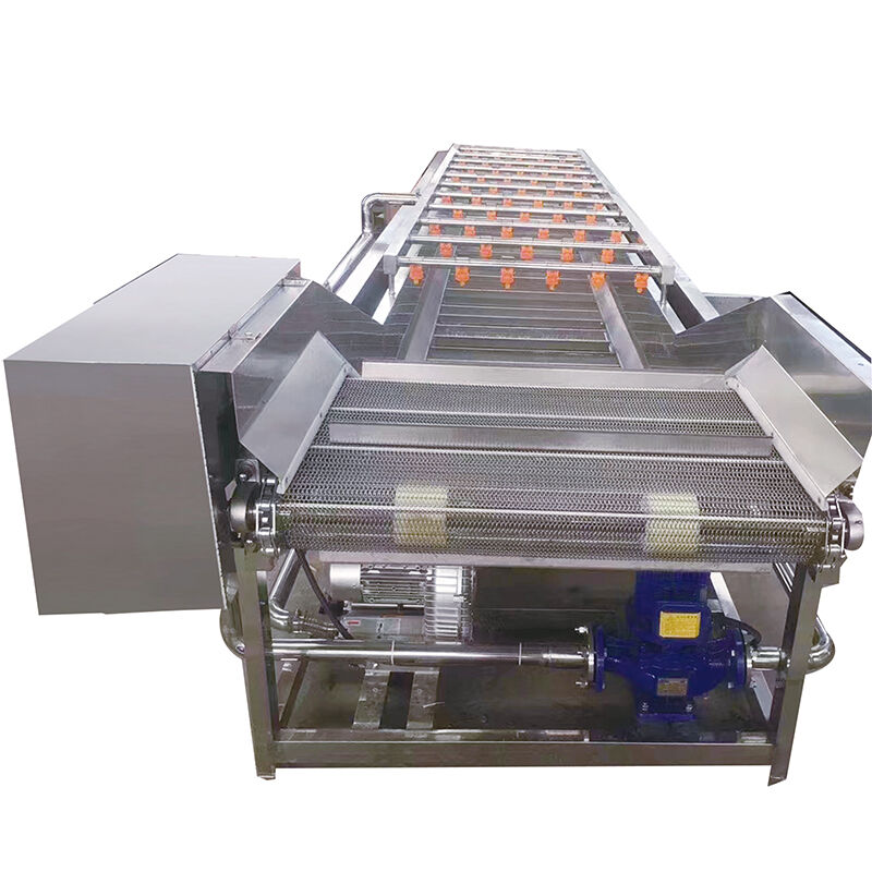 The fruit and vegetable washing machine, also known as a bubble washing machine, primarily uses stainless steel mesh belts or chain plates as its conveying medium, hence it is also referred to as a mesh belt washing machine.