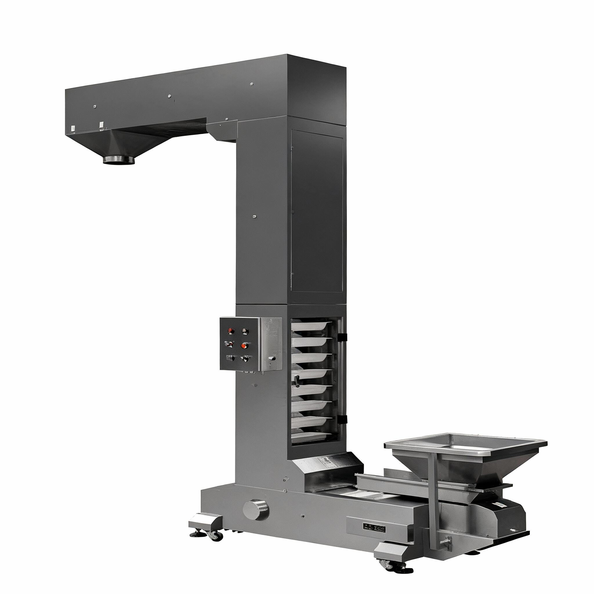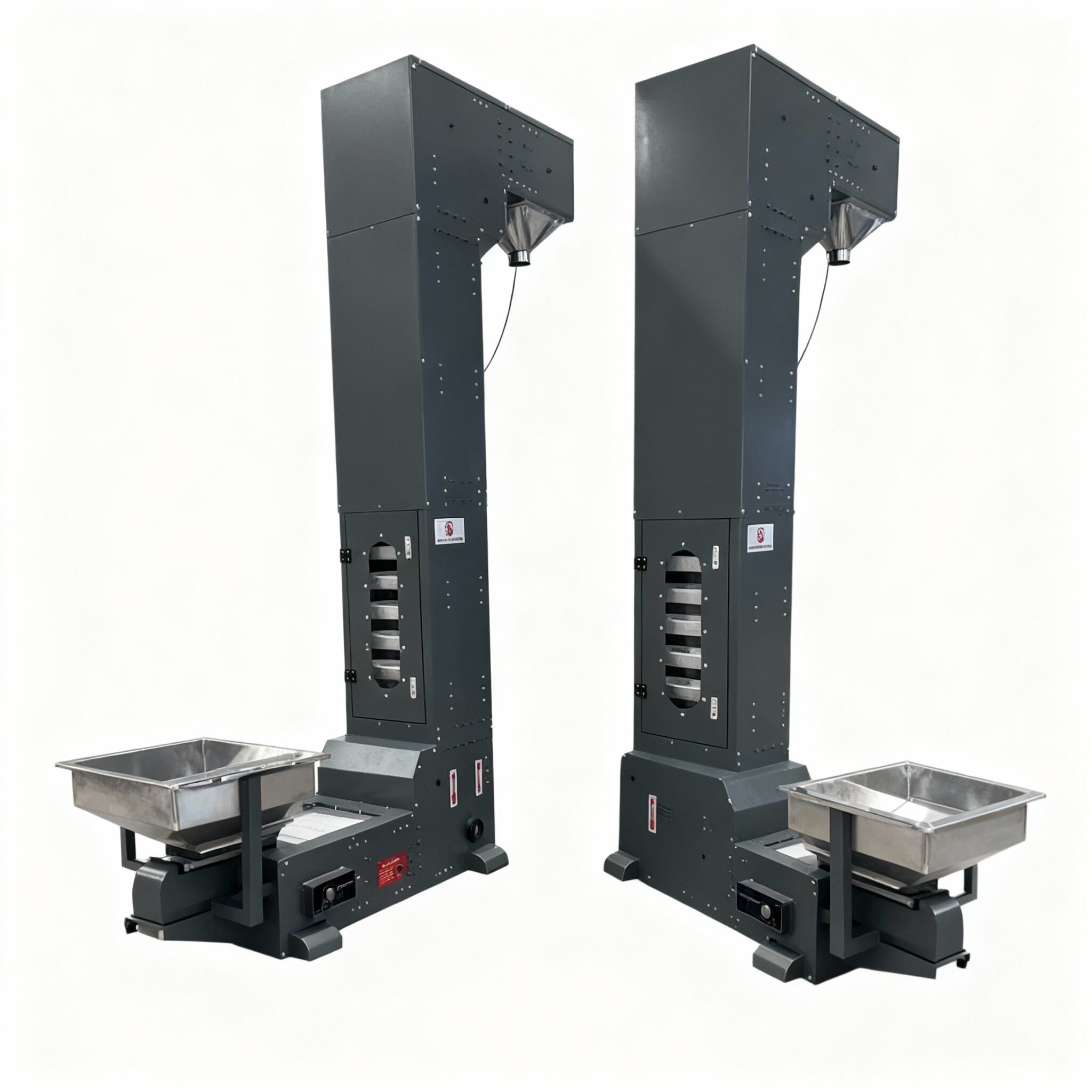 The hopper lift conveyor, also known as a bucket elevator, is designed for material transfer from lower to higher levels. After materials are fed into the hopper via a vibrating table, the machine automatically operates continuously to transport them upward. The conveying speed can be adjusted according to the required throughput, and the lifting height can be selected as needed. The hopper is self-designed and manufactured, with non-toxic PP material making this type of bucket elevator more widely applicable. All dimensions are custom-designed to meet actual requirements, compatible with vertical packaging machines and computerized metering systems. It is suitable for elevating and feeding products such as food, pharmaceuticals, chemical industrial goods, screws, and nuts. The machine can be automatically controlled to start or stop based on signals from the packaging machine.