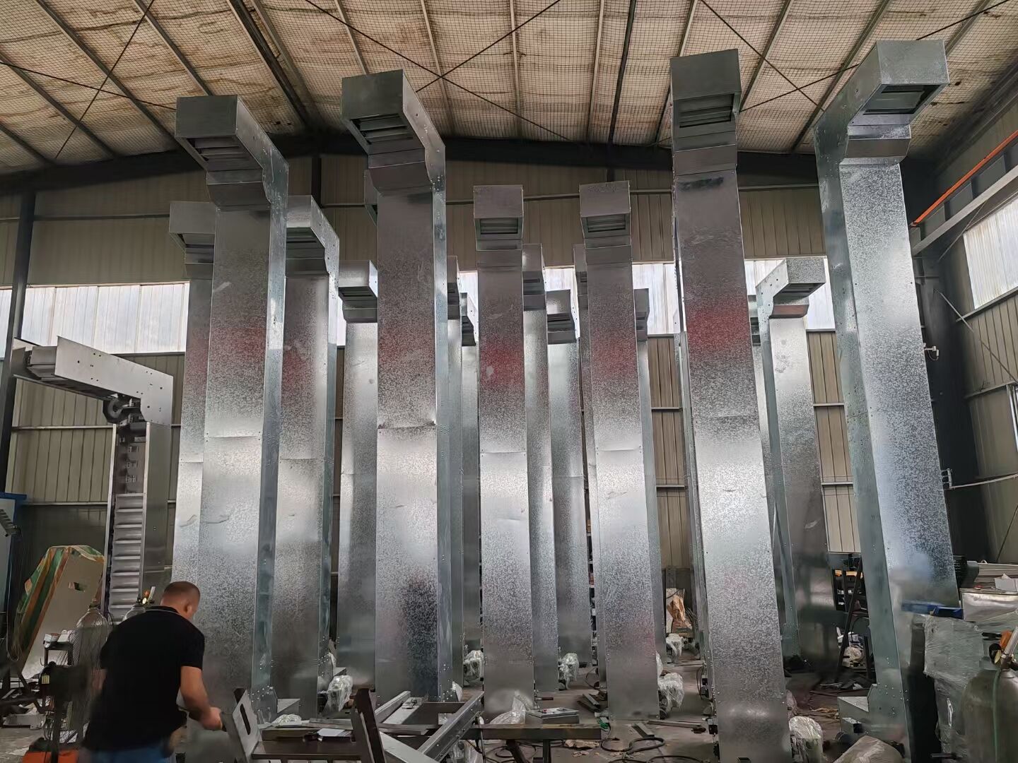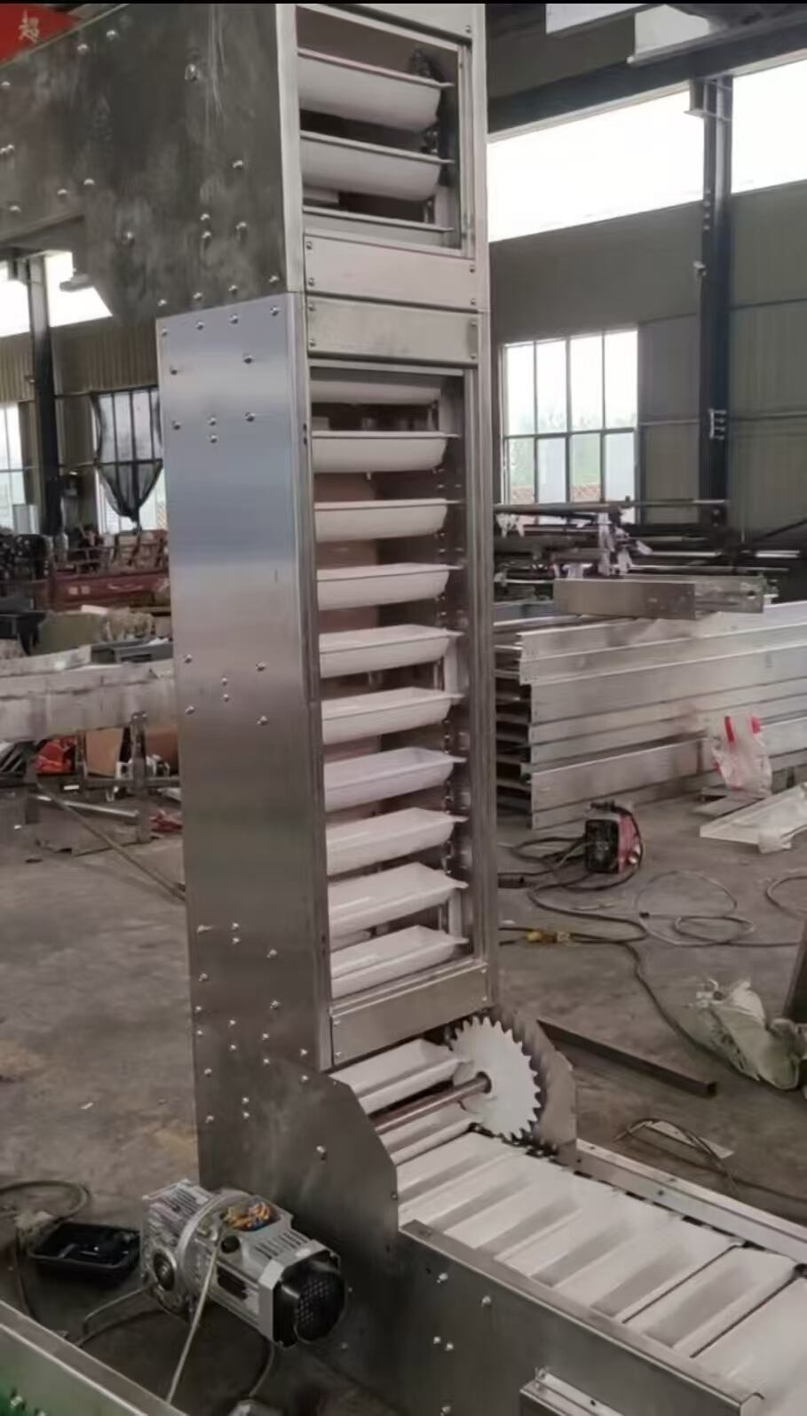 The hopper scoops material from the lower storage bin, which is then lifted to the top by the conveyor belt or chain. After passing over the top pulley, the material is flipped downward and discharged into the receiving trough by the bucket elevator. Belt-driven bucket elevators typically use rubber belts mounted on drive drums at the bottom or top, along with deflection drums on both sides. Chain-driven models usually feature two parallel drive chains with a pair of driving sprockets at the top or bottom and a pair of deflection sprockets at the bottom or top. Most bucket elevators are equipped with a casing to prevent dust dispersion.