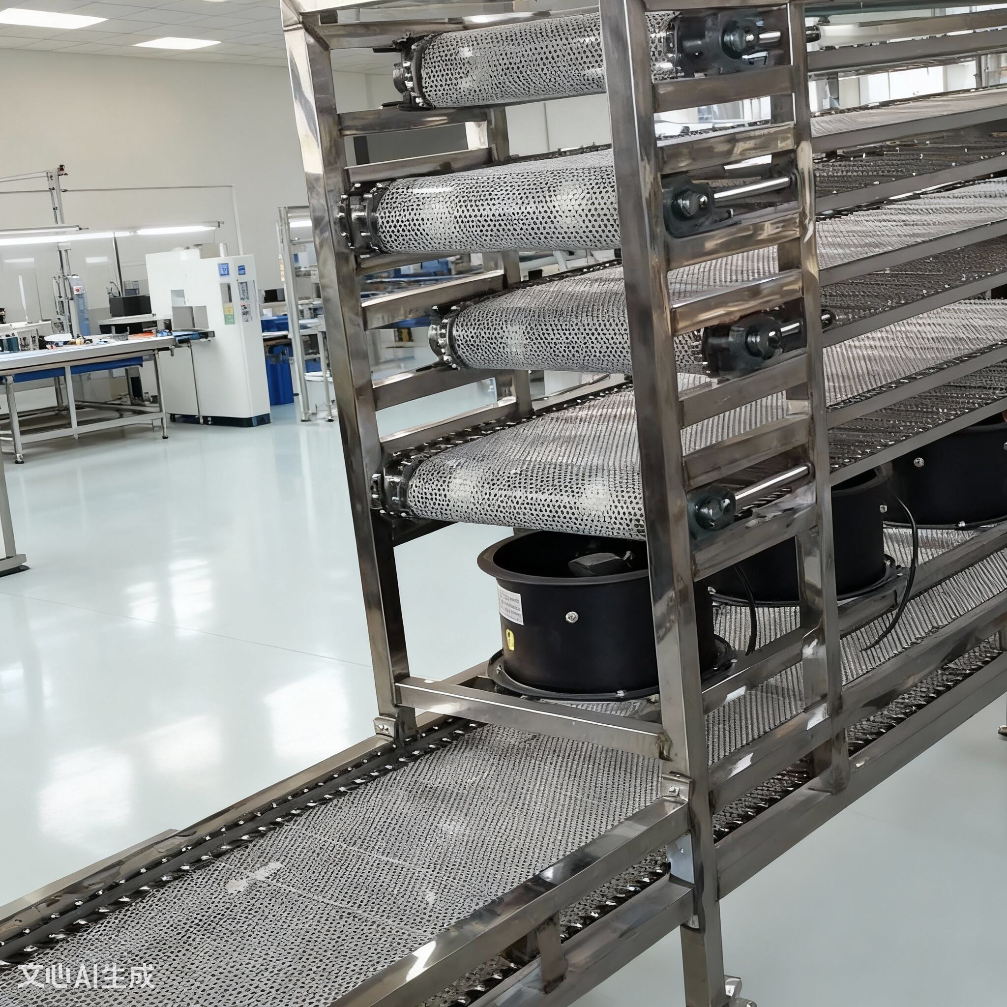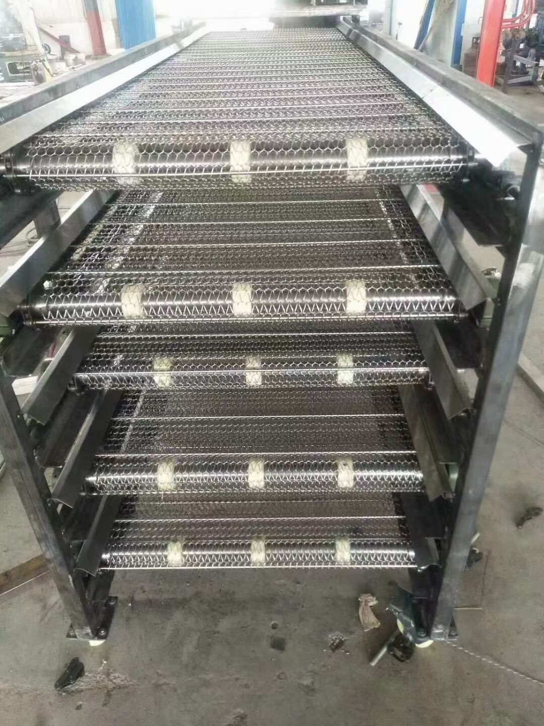 Mesh belt conveyors come in various configurations, with multilayer mesh belt conveyor models being one such variant. Typically designed with 3 or 5 layers, this conveyor system facilitates continuous material transfer through sequential flipping. A key advantage of multi-layer conveyors is their compact length without reduced transport distance, making them ideal for drying and cleaning applications. Materials are conveyed starting from the topmost layer, descending progressively through each layer until discharged from the final layer. During this process, heating or nozzle installation can be employed to achieve drying or cleaning. Essentially, multilayer mesh belt conveyors are modular combinations of single-layer systems.
